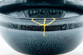 The term 'tenmoku' can refer to two things: the shape of a bowl, i.e. conical with a finger groove and flare at the lip; and a dark high-iron glaze that can produce various beautiful effects under the right firing conditions. Both of these originated in Jian ware from Fujian during the Song dynasty (960-1279) in China, where the dark colour of the glaze was praised for the way it contrasts nicely with the froth of whisked tea.