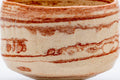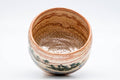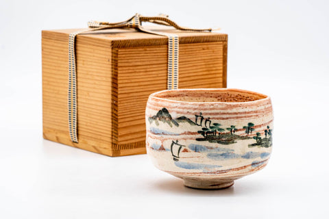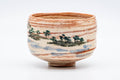 This Raku chawan (matcha bowl) has a pinkish appearance due its agate-like striations of red and white glaze. The shomen (正面 - face/front) is decorated with a landscape scene of a forest, sea, and distant mountains.
