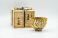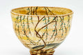 This Kyo-yaki chawan (matcha bowl) is features a yellow ochre Irabo-style glaze, decorated with delicate botanical painting.