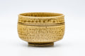 This Seto-yaki hantsutsu-gata chawan (matcha bowl) has a slightly flared lip, is decorated with two score lines, and is draped in a mottled Ki-seto (黄瀬戸 - yellow Seto) glaze