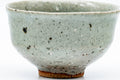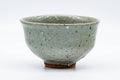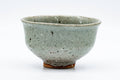 This komogai-nari chawan (matcha bowl) features a subtly flared lip and is covered in a greenish-grey glaze webbed with fine crazing and dotted with iron spots.