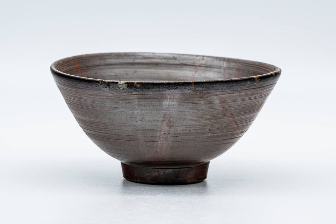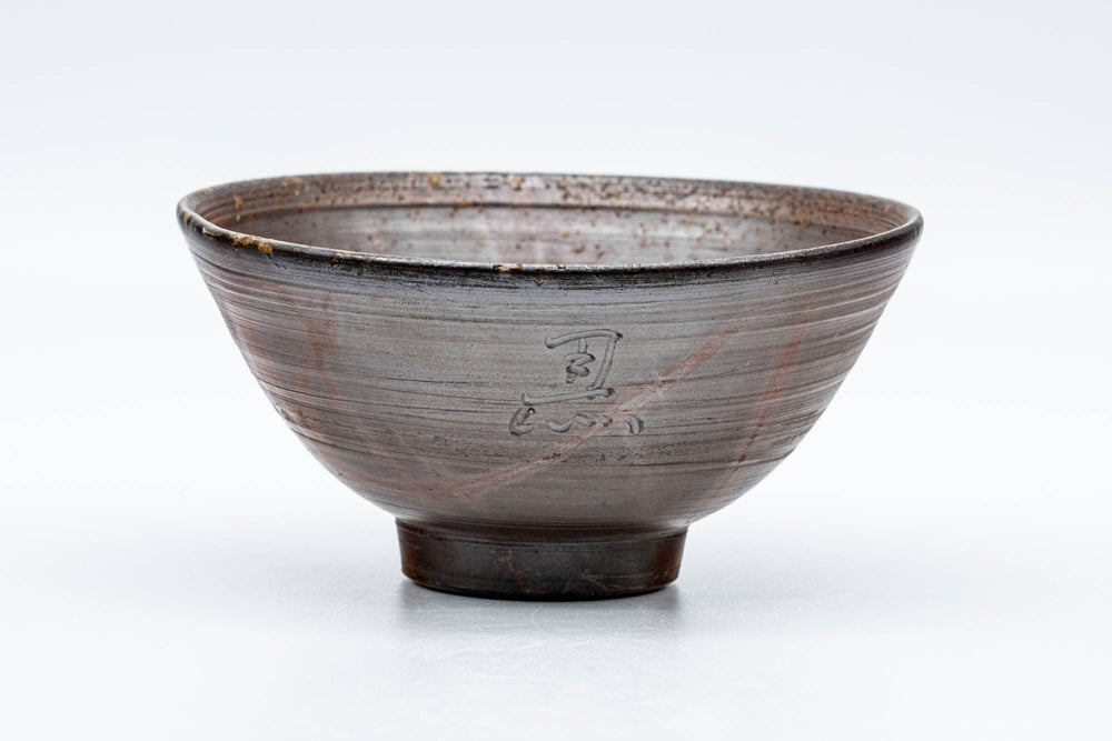 This ido-gata Bizen-yaki chawan (matcha bowl) features an unglazed finish, typical of Bizen ware, with a dark colour marked with a subtle hidasuki (緋襷) pattern. This traditional decoration is created when the potter wraps rice straw around a piece before placing it into the kiln, where the alkalines in the straw react with iron in the clay body to produce these striking scarlet burn marks. The front of the chawan is also marked with the reverse of the kanji 馬 - horse.