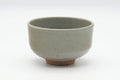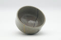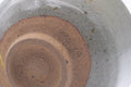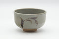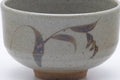 This Karatsu-yaki chawan (matcha bowl) is made in the half-cylindrical shape and features a mottled grey glaze, decorated with a painting of a plant in the iron underglaze style (鉄絵 - testu-e). This chawan was made by Shinzan Kiln (辰山窯).