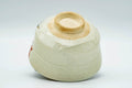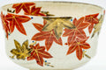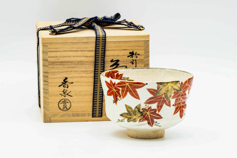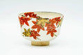 This hantsutsu-gata Kyo-yaki chawan (matcha bowl) features a soft white glaze decorated with red and gold momiji (Japanese maple) leaves.