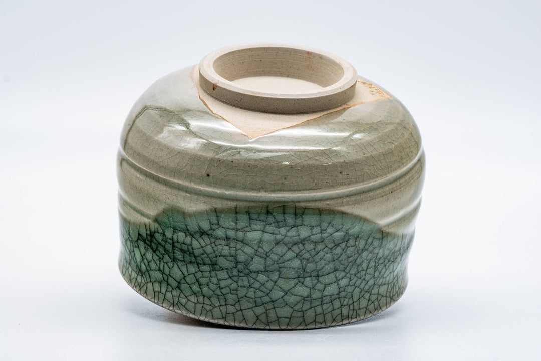 This Obori Soma-yaki chawan (matcha bowl) features the classic crazed celadon glaze that this style is known for, accented with a second layer of the glaze, which deepens its blue-green hue.