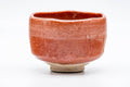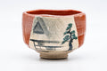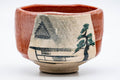 This hantsutsu-gata Aka-raku chawan (matcha bowl) features a crazed vermilion red and glaze, with the shomen (正面 - face/front) decorated with a painting of a pine tree and house atop a patch of white glaze.