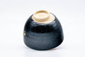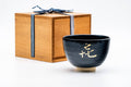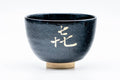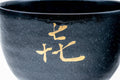 This stoic Kyo-yaki chawan (matcha bowl) features a subtle tenmoku yuteki pinhole glaze, and a wide interior base and foot. It's shomen is painted gold with 七十七, meaning "77". Yuteki (油滴 - oil-spot) is one of the most popular style of tenmoku glazes, consisting of silvery spots of iron crystals suspended on a blue or black backdrop, like oil on water.