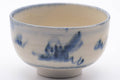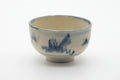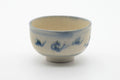 This chawan (matcha bowl) features an abstract blue and beige glaze.