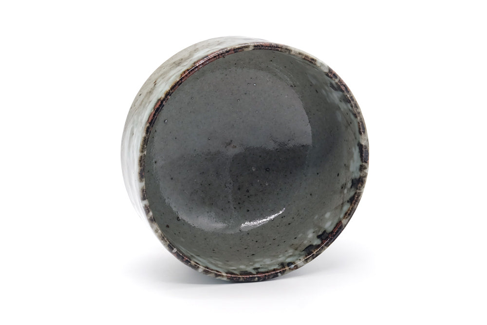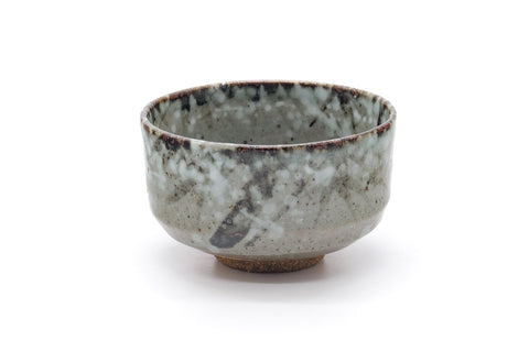 This unique chawan (matcha bowl) features an abstract grey and white speckled glaze over a silhouette of momiji, reminiscent of winter snow. Made by 竹に雪.