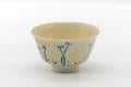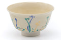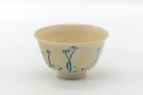 This hatazori-gata Kyo-yaki chawan (matcha bowl) features a beige glaze decorated with a blue, green, and gold abstract dotted motif.