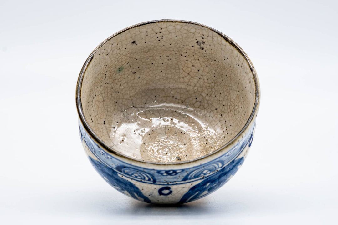 This antique wan-nari chawan (matcha bowl) is made in the Annan or Vietnamese style, with abstract blue painting and a crazed white glaze dotted with pinholes.