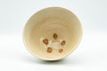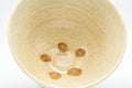 This beautiful Ido chawan (matcha bowl) is made in the Ao-ido (青井戸 - blue Ido) style, and as such features a colder blue-tinged beige glaze and a straight conical shape that extends linearly from the tall bamboo node-shaped foot (竹の節高台 - takenofushi koudai). Like most great Ido chawan, this bowl has a subtle spiraled shape with gentle rokurome (ろくろ目 - potters' wheel marks) which shows the flow of the potter's fingers as they shaped the piece on the wheel, and also exhibits beautiful 'kairagi' (かいらぎ/梅花皮 - plum flower texture) on and around its foot. This unique glaze texture is highly praised among Ido chawan collectors. On the inside of the bowl, there are five small unglazed spots where balls of clay were used to separate the stacked bowls in the kiln.