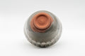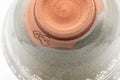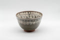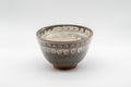 This wan-nari Kyo-yaki chawan (matcha bowl) features a grey glaze with floral mishima (三島手, slip inlay) designs and a hakeme (刷毛目, brush stroke) design on the inside of the bowl. Made by Asami Yoshizou (浅見 与し三) at the Yoshimine Kiln (吉峯窯).