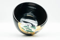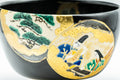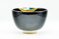 This wan-nari Kyo-yaki chawan (matcha bowl) features a stunning jet black glaze decorated with gold spheres, and motifs of bonsai trees and musicians. Made by Azan Tsuji 通次阿山.
