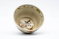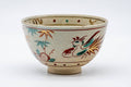 This wan-nari Shibukusa-yaki chawan (matcha bowl) features a grey glaze decorated with gold and red rooster, plus bamboo motifs and geometric patterns.