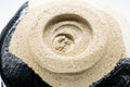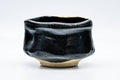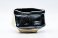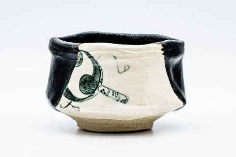This kutsu-gata (clog-shaped) Kuro Oribe chawan (matcha bowl) features a wonderfully distorted shape, draped in a black and white glaze and decorated with a painting of an uchiwa or Japanese fan.