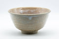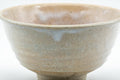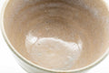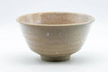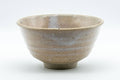 This hatazori-gata chawan (matcha bowl) features a warm beige and white glaze over a conical form with a slightly flared lip, evoking Korean style bowls.
