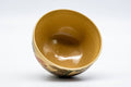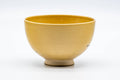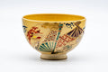 This Kyo-yaki chawan (matcha bowl) features a beige-yellow glazed decorated with an array of abstract geometric motifs.