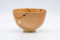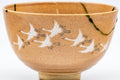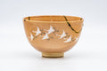 This wan-nari Kyo-yaki chawan (matcha bowl) features a beige-tan glaze decorated with a flock of soaring egrets.