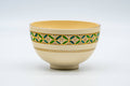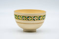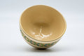 This wan-nari Kyo-yaki chawan (matcha bowl) features a smooth beige glaze decorated with gold around its rim and green geometric patterns.