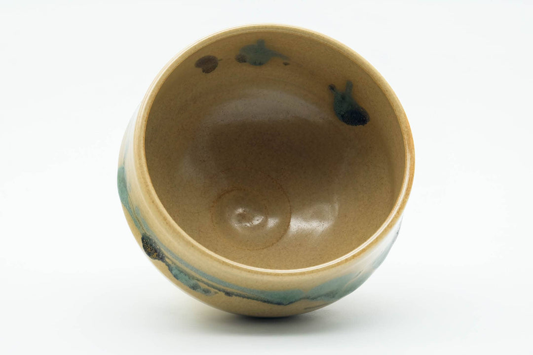 This Kyo-yaki chawan (matcha bowl) features a smooth beige glaze decorated with an abstract green-teal pattern.