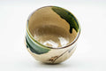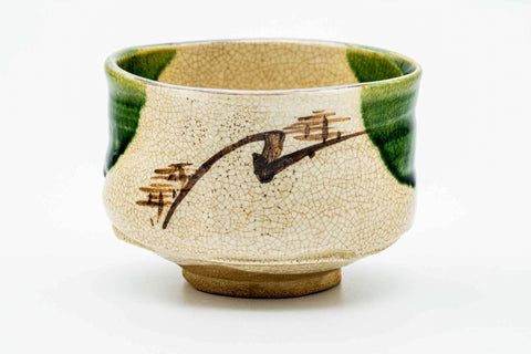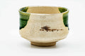 This Oribe-yaki chawan (matcha bowl) features a stunning beige and green drip-glaze with decorative motifs.