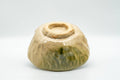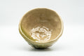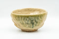 This heavy, wabi-sabi, hand-formed chawan (matcha bowl) features a beige and green glaze.