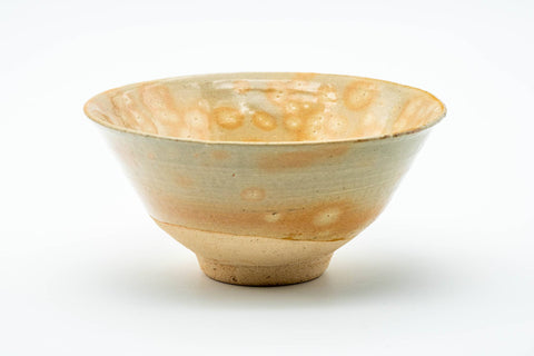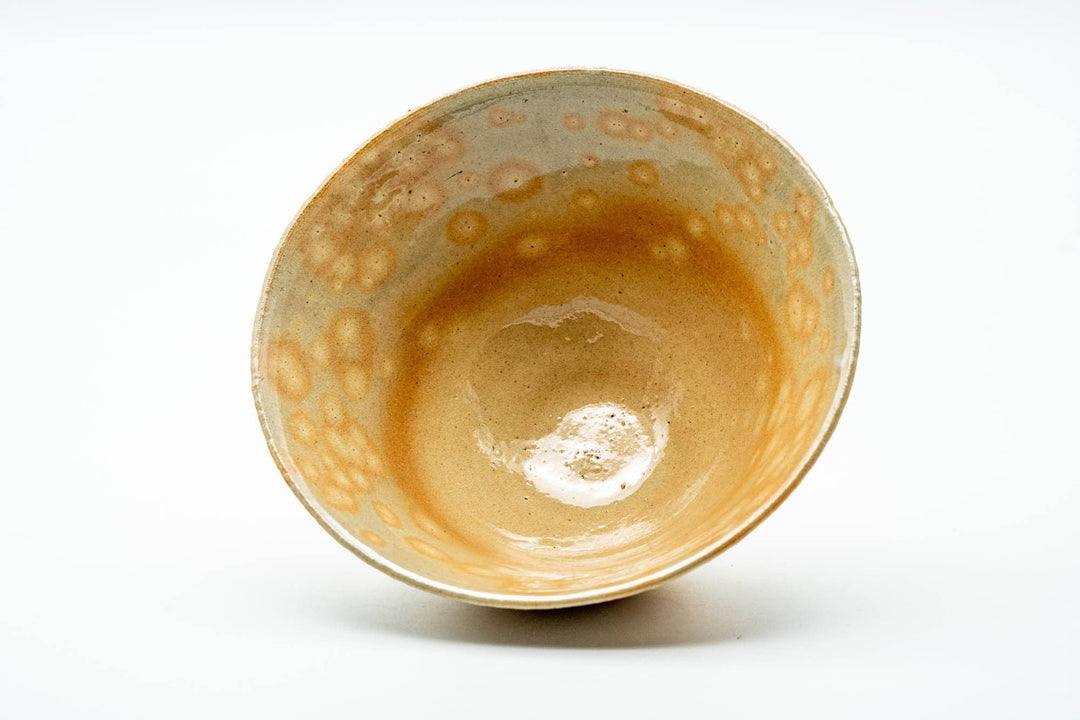 This small Hagi-yaki chawan (matcha bowl) features a beige glaze decorated with gohonte pink spots.