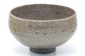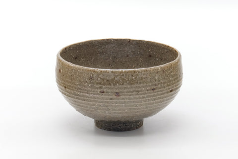 This wa-nari chawan (matcha bowl) features a textured beige glaze with visible rokurome (ろくろ目 - potters' wheel marks) which shows the flow of the potter's fingers as they shaped the piece on the wheel.