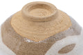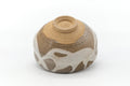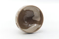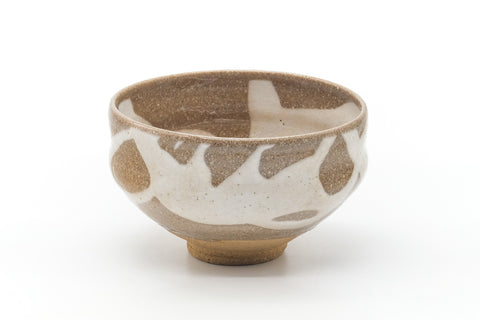 This chawan (matcha bowl) features a beige-yellow glaze decorated with an abstract white pattern.