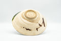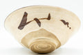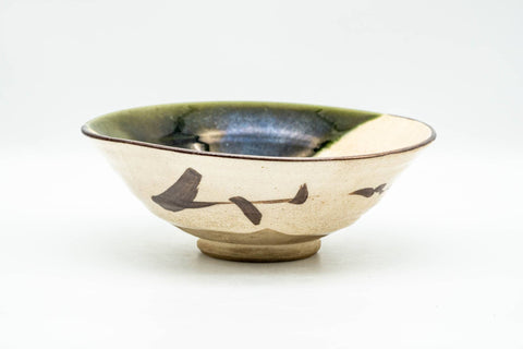 This Oribe-yaki summer chawan (matcha bowl) features a beige and green enamel glaze decorated with abstract motifs.