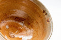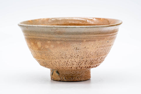 This beautiful Ido chawan (matcha bowl) is made in the O-ido (大井戸 - large Ido) style, and as such has a roughly conical shape and a tall bamboo node-shaped foot (竹の節高台 - takenofushi kōdai). Like most great Ido chawan, this bowl has a subtle spiraled shape with gentle rokurome (ろくろ目 - potters' wheel marks) which shows the flow of the potter's fingers as they shaped the piece on the wheel, and also exhibits beautiful glaze crawling called 'kairagi' (かいらぎ/梅花皮 - plum flower texture) on and around its roughly trimmed foot. This unique glaze texture is highly praised among Ido chawan collectors. Atop the iron-rich clay, this chawan sports a lovely, deep biwa-iro (枇杷色 - loquat-coloured) glaze. On the inside of the bowl, there are five small unglazed spots where balls of clay were used to separate the stacked bowls in the kiln
