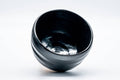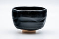 This Raku-yaki chawan (matcha bowl) sports an abstract faceted body with a sleek black glaze, and a hairline crack over the rim from its past life.