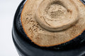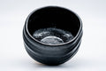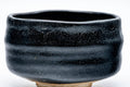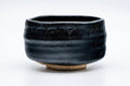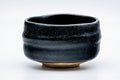 This wabi Seto-yaki chawan (matcha bowl) features a thick black weathered glaze.