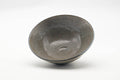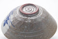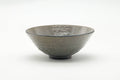 This hira-gata summer chawan (matcha bowl) features a dark grey glaze with white and blue floral exterior decorations.