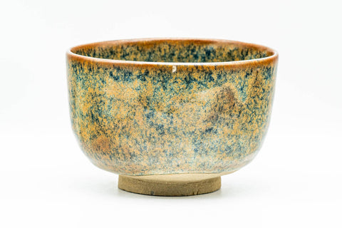 This hantsutsu-gata chawan (matcha bowl) features a wonderful green and blue speckled glaze.