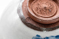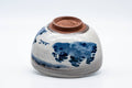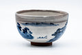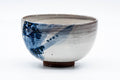 This Kiyomizu-yaki chawan (matcha bowl) features a grey-blue brush stroke glaze decorated with a village painted among mountainous motifs.