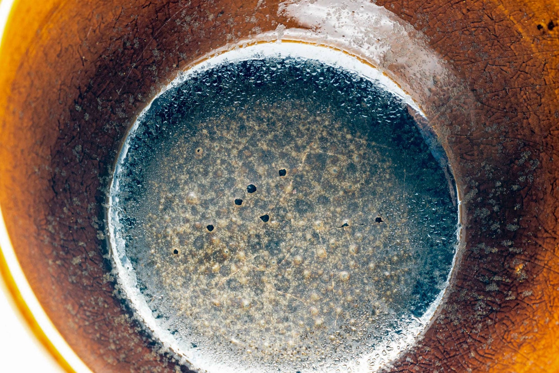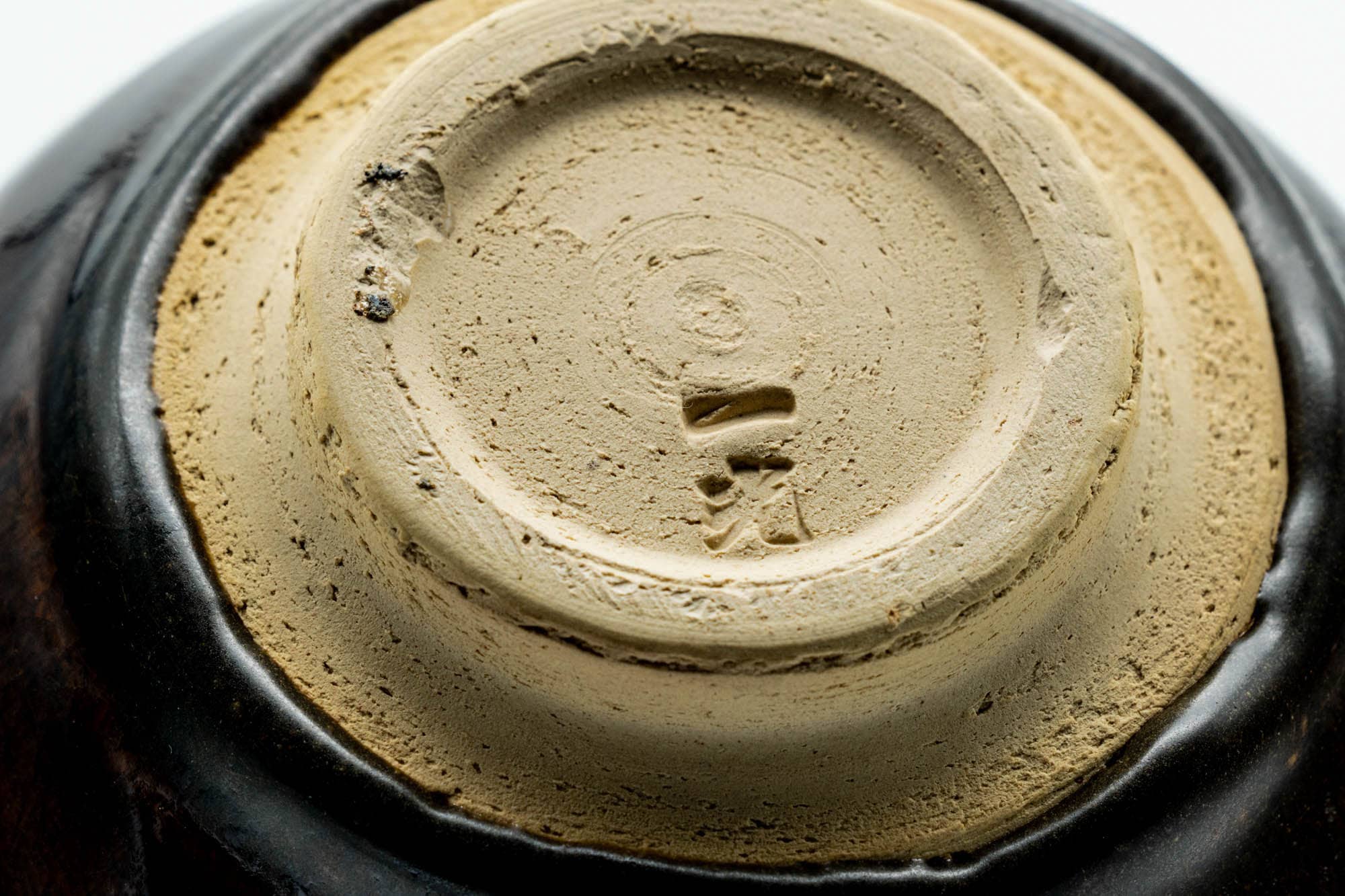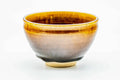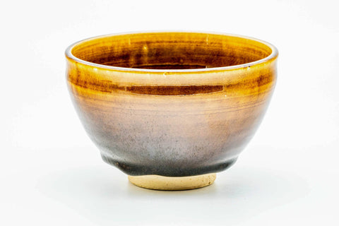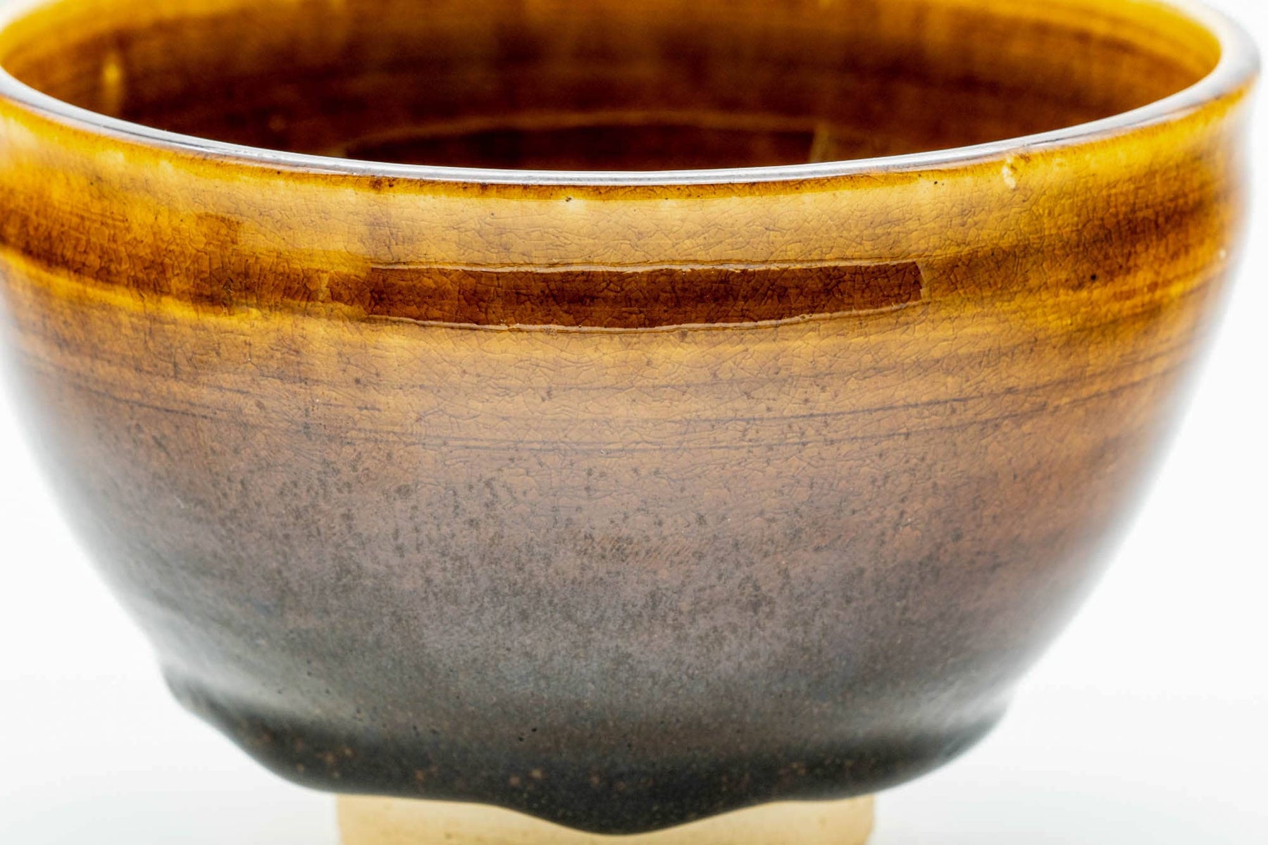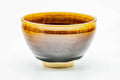 This tenmoku-gata chawan (matcha bowl) features a stunning brown and yellow drip-glaze.