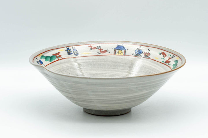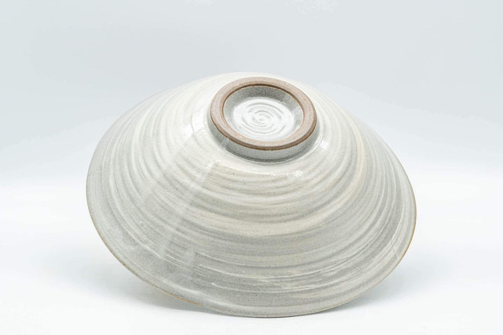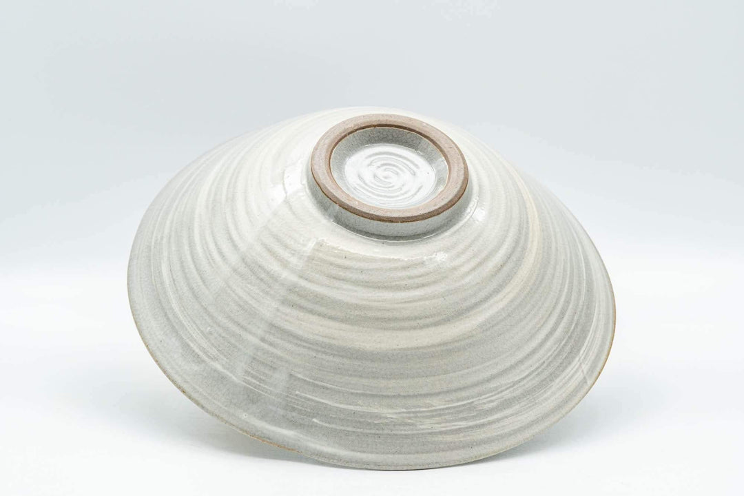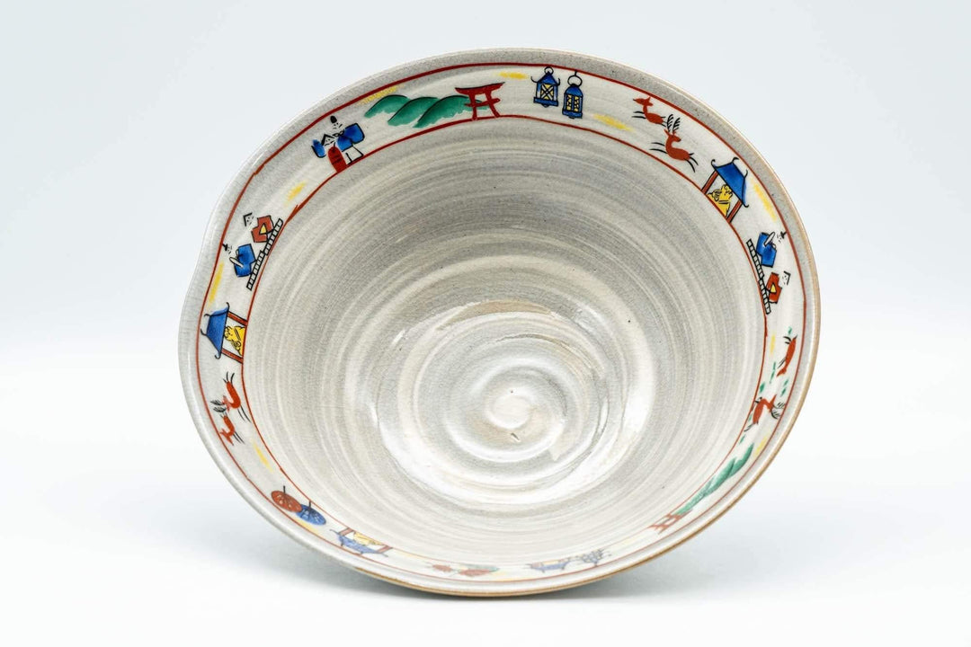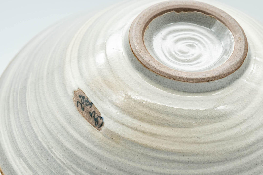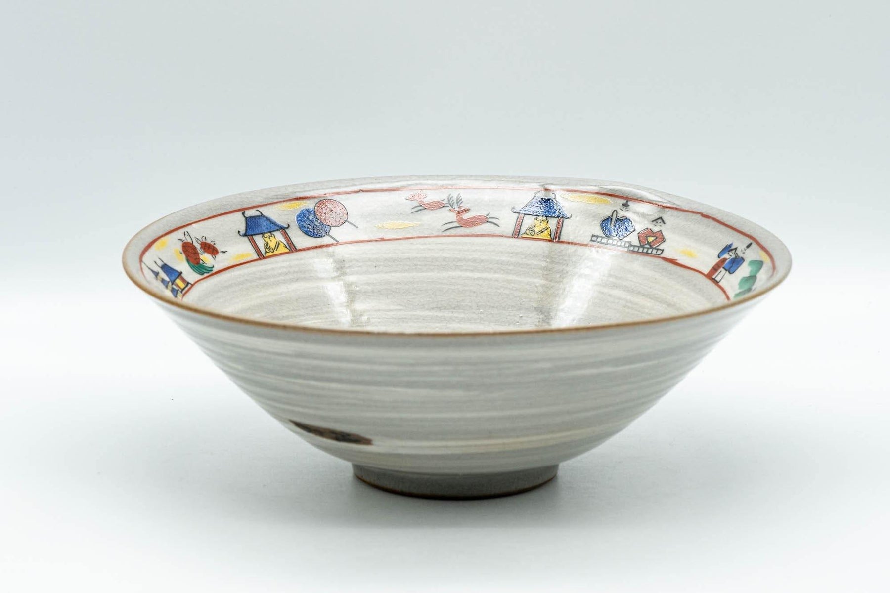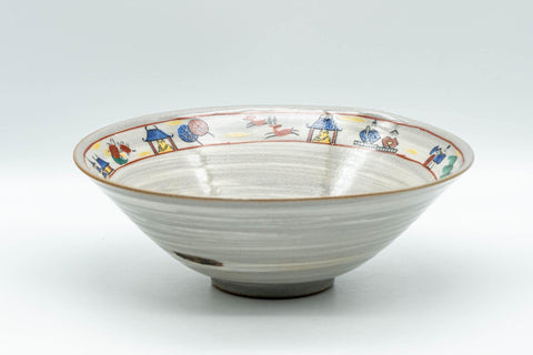 This wide Japanese chawan (matcha bowl) features a grey and white spiraling glaze with vllage motif decorations bordering the lip.