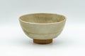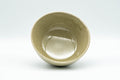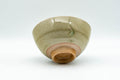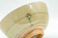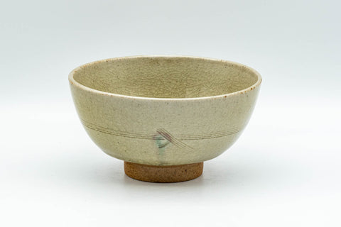 This small sugi-nari chawan (matcha bowl) features an elegant crazed green celadon glaze centered around a geometric emblem.