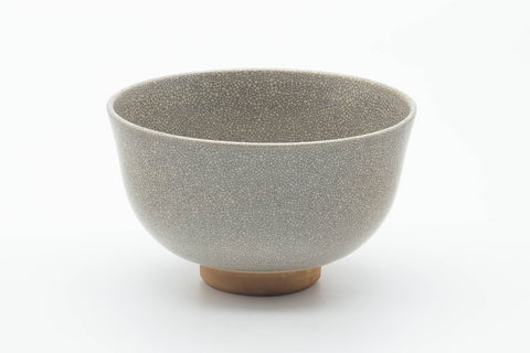 This wan-nari chawan (matcha bowl) features a finely crazed grey glaze with minor tea stains from natural use over the years.