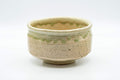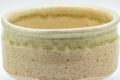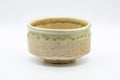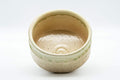 This hantsutsu-gata chawan (matcha bowl) features a mint-green drip glaze. The bowl also has a finger indent around the lip and a spiral-shaped chadamari ('tea pool', the indent at the base of the bowl where the left over tea pools).