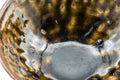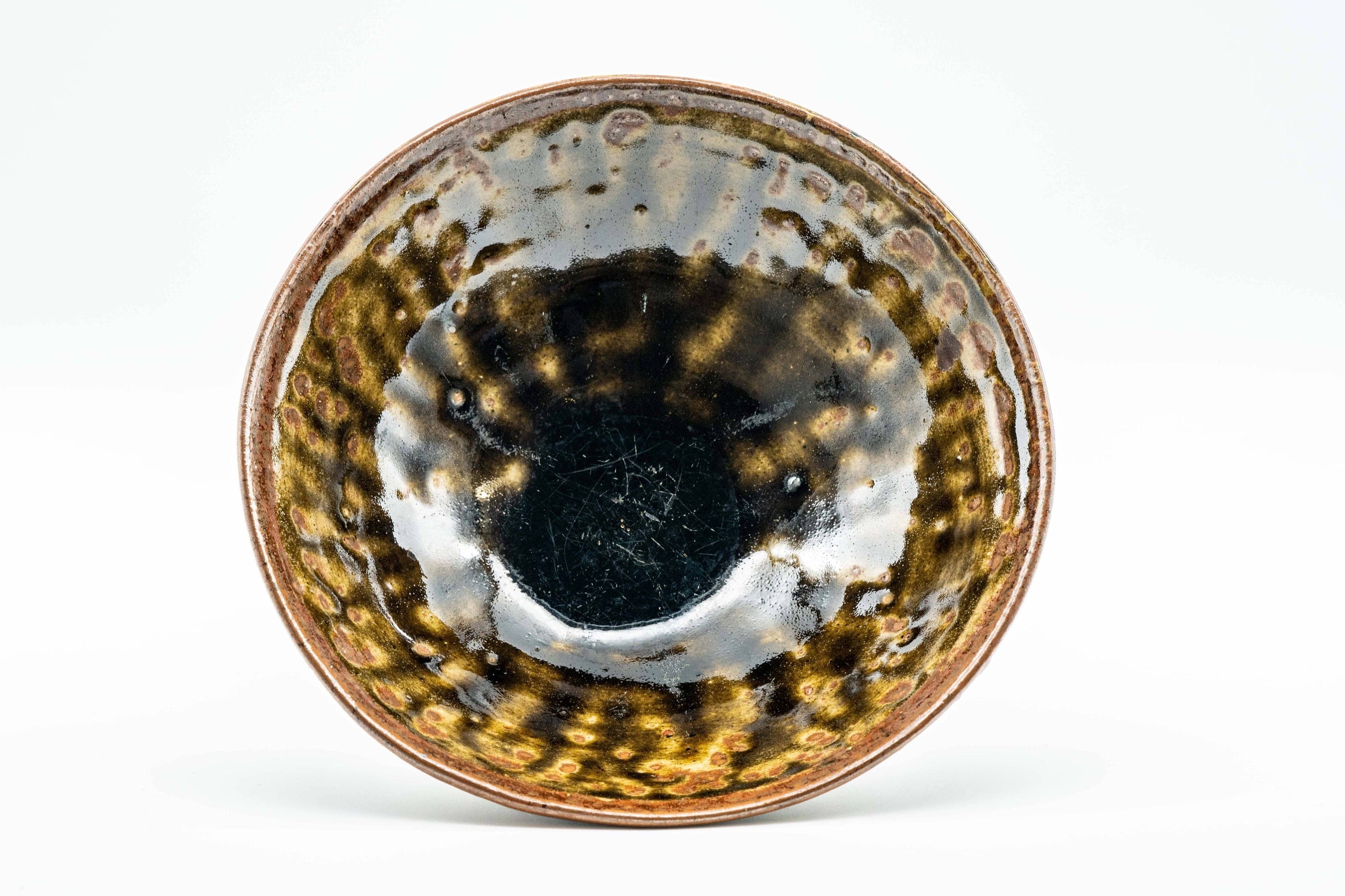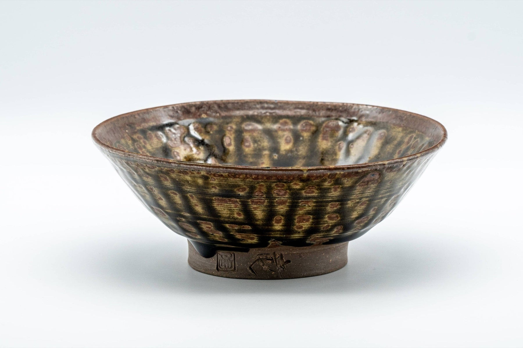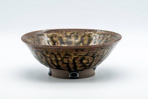 This hira-gata chawan (matcha bowl) features a dark green glaze with intense crawling, which leaves spots of lighter glazed or unglazed clay, resulting in a oil-spot like effect. Its flatter shape is perfect for letting tea cool down in the warmer months.