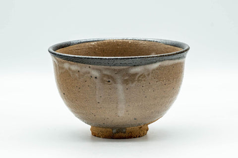 This komogai-nari chawan (matcha bowl) features a solid brown glaze with a black around its lip, and a white drip-overglaze.