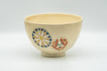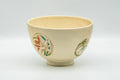 This Kyo-yaki chawan (matcha bowl) features a weathered beige glaze decorated with floral and geometric motifs