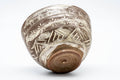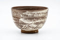 This wan-nari chawan (matcha bowl) is decorated in the Mishima technique with a brown glaze contrasting against the white slip inlay of geometric patterns and stamped chrysanthemums.