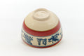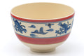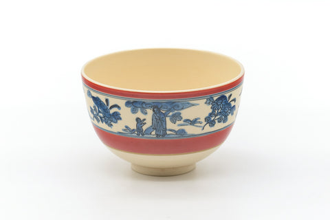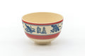 This beautiful Kyo-yaki chawan (matcha bowl) features a beige glaze decorated with red and blue flowers and traditionals motifs.
