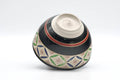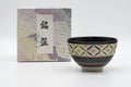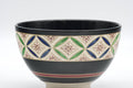 The Kyo-yaki summer chawan (matcha bowl) features a black glaze with colourful geometric pattersn.