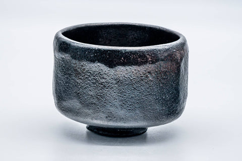This classic kuro-raku chawan (matcha bowl) features a subtly faceted shape with visible herame (箆目 - spatula marks) and a hint of rust red on the shomen (正面 - face/front).