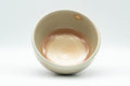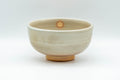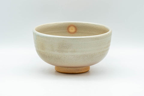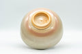 This Hagi-yaki wan-nari chawan (matcha bowl) features a warm beige with peach spots in a pattern known as 'gohonte'.
